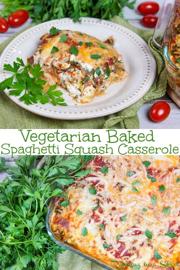 This Baked Vegetarian Spaghetti Squash Casserole recipe is the perfect low carb - gluten-free, cheesy, and delish meal. It tastes like lasagna or baked spaghetti but without the pasta! This dinner is great for making ahead and it freezes well.