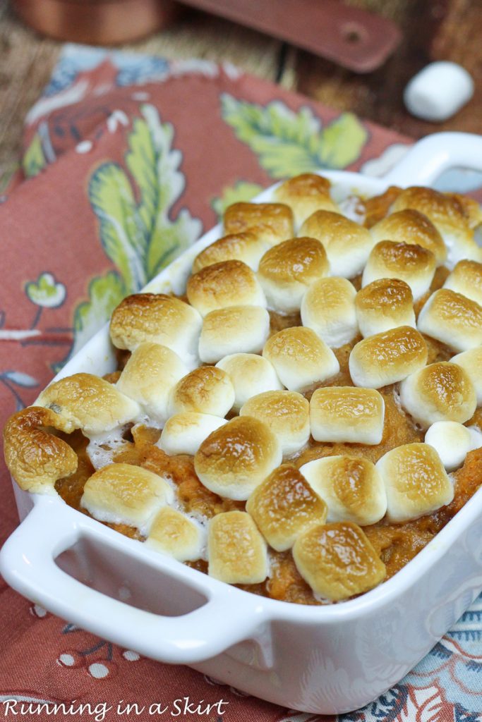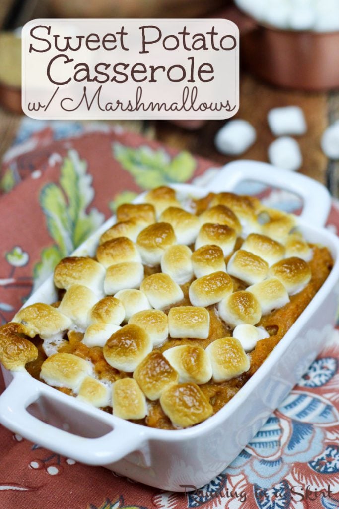 My son LOVES sweet potato casserole, and this recipe is so simple to make. I used ½ the brown sugar called for in this recipe (because honestly, sweet potatoes are quite sweet on their own), and I used 1% milk to cut back on some calories. This worked out very well and it came out with the perfect flavor (just the right sweetness) and it looked so pretty with the toasted marshmallows on top. Another bonus for my family is that this recipe does not call for any nuts of any kind. Big bonus for my daughter who has a peanut and tree nut allergy! Thank you for this wonderful recipe!