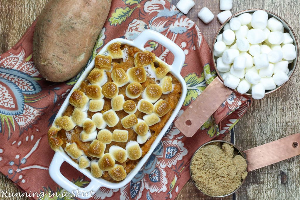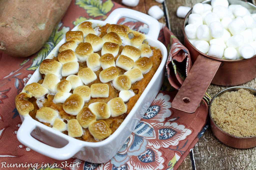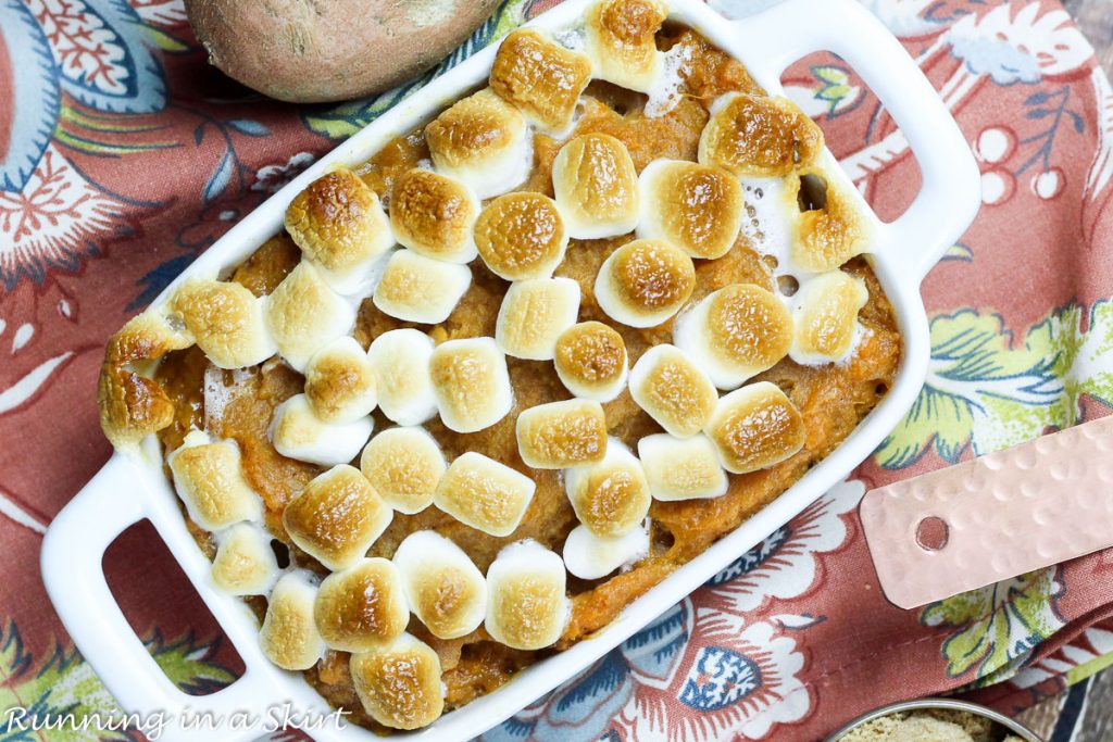 This is hands down the best Sweet Potato Casserole with marshmallows. This classic southern dish was first made by my grandmother, and then my Mom, and now me, for holidays. It's been on Running in a Skirt for over a decade and has been viewed almost 400,000 times. It's a classic holiday comfort dish with cozy mashed sweet potatoes, seasoned with brown sugar, butter, and cinnamon. It's then baked off with fluffy marshmallows and browned to golden perfection. It has just the right amount of butter and sweetness to be the star of your holiday table.
