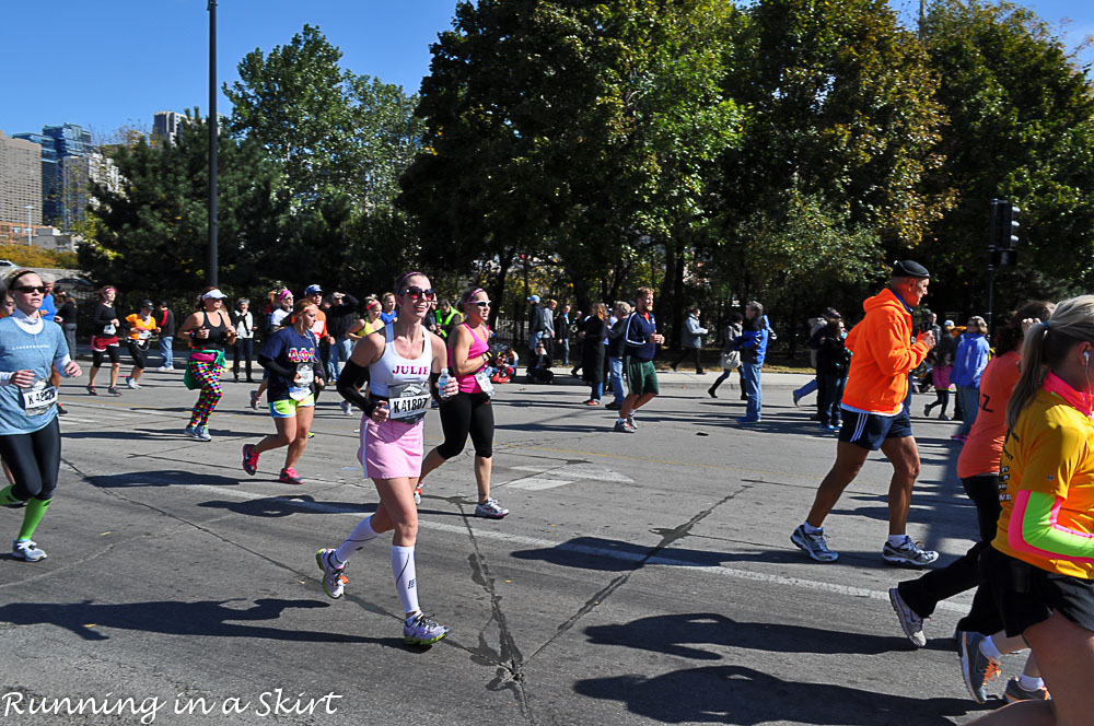 The good part about taking my sweatshirt off though is now people can see my name on my shirt.. Strangers start cheering for me by name! I even hear one person yell-- “RUN Julie in a skirt!” That still makes me laugh.