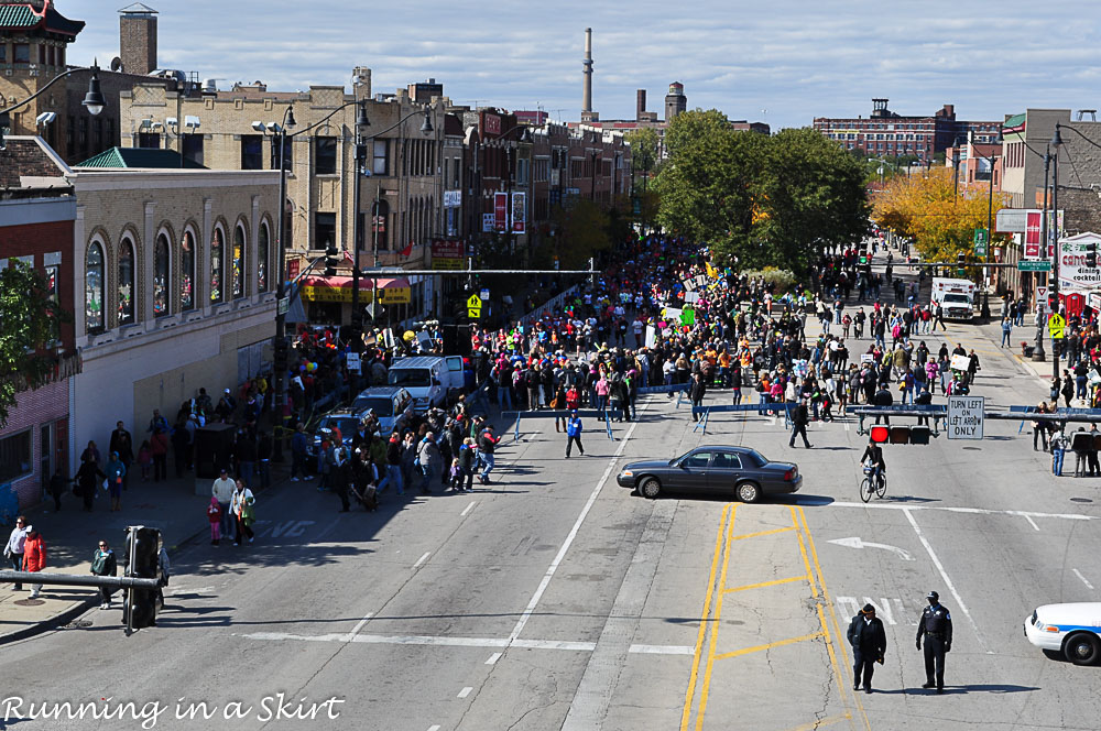 Through mile 12 we run in and out of some beautiful neighborhoods. There are church cheer stations, full bands, men putting on YMCA skits in skirts and even drum lines. All the entertainment along the course is from residents who had come out and set up along the street, nothing official from the marathon. It is truly a community event. This race really showcases the best of Chicago.