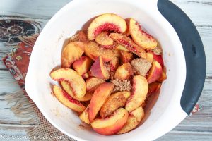 - In a medium bowl toss together the fresh sliced peaches, brown sugar, and cinnamon.