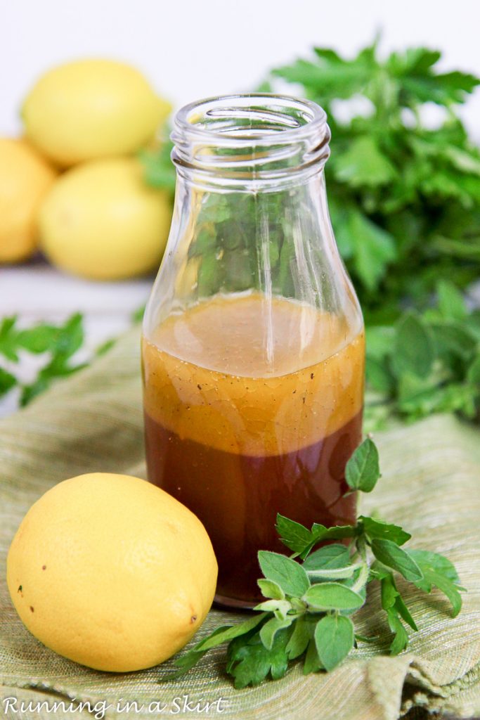 - Put all ingredients- the red wine vinegar, olive oil, lemon, garlic, and oregano- in a jar and mix well. You can shake it in a jar with a tight-fitting lid or whisk it together in a small bowl.