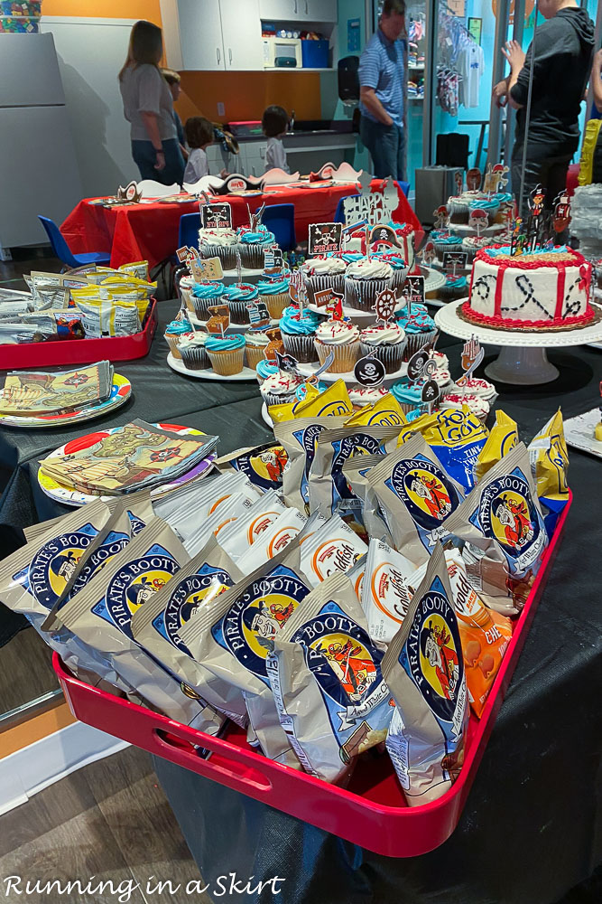 And some fun packaged snacks on a theme like Pirate's Booty, goldfish, and Rold "Gold" pretzels. I love a good theme and had so much fun coming up with ideas for the pirate birthday party. It's such a fun theme.