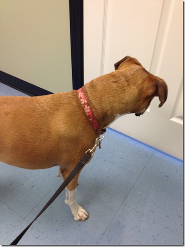 Reina got a funny looking spot on her last week. It didn’t seem to bother her or cause her pain, but it looked really strange. At first we thought it was a bug bite or an ingrown hair but it grew very quickly over the weekend and neither the hubs or I had any good explanation what it was. SO.. off to the vet we go! The hubby didn’t tell me at the time, but he was worried it was something really serious. I just thought it was an infected bite or something.![]()