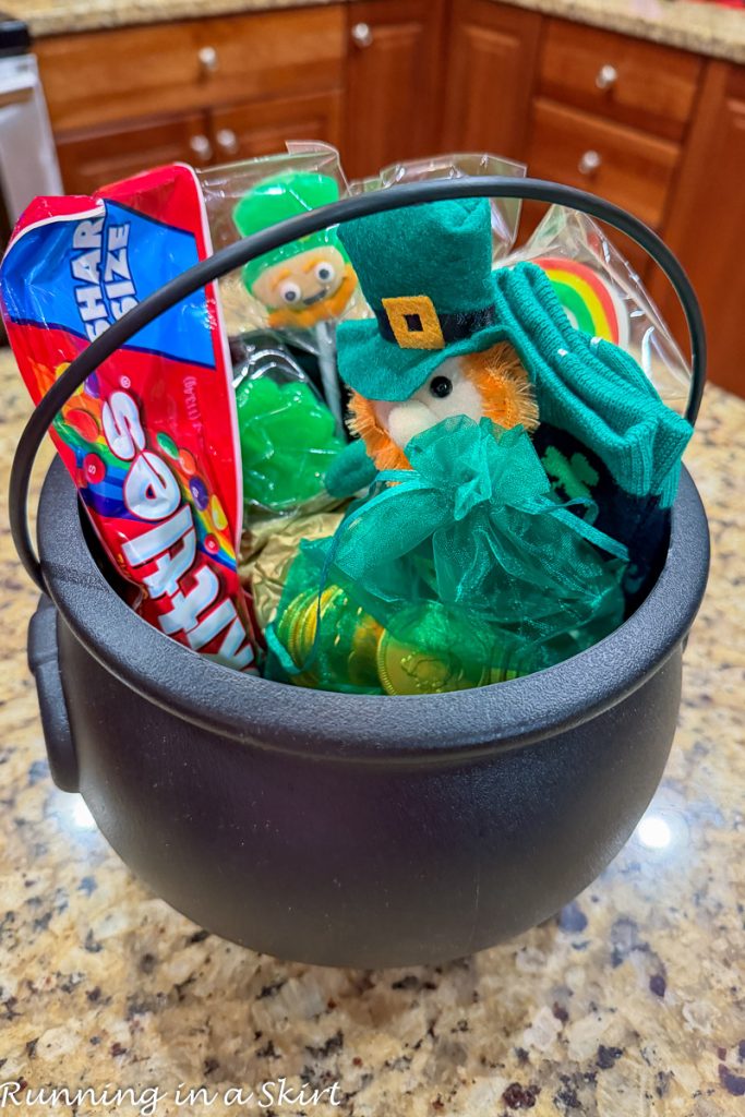 We still didn't catch him, but he did leave behind a pot of gold. 🙂 It had some fun goodies. He also made a huge mess in the living room.